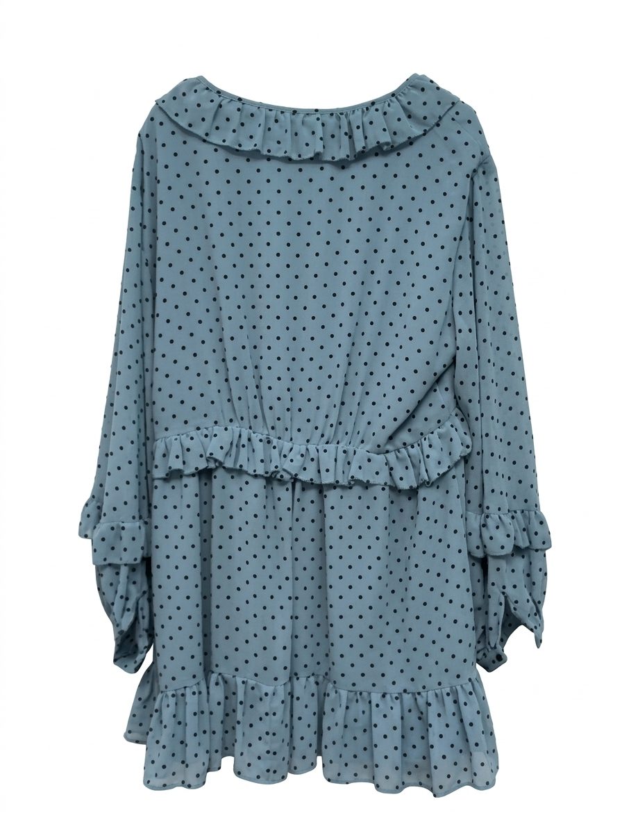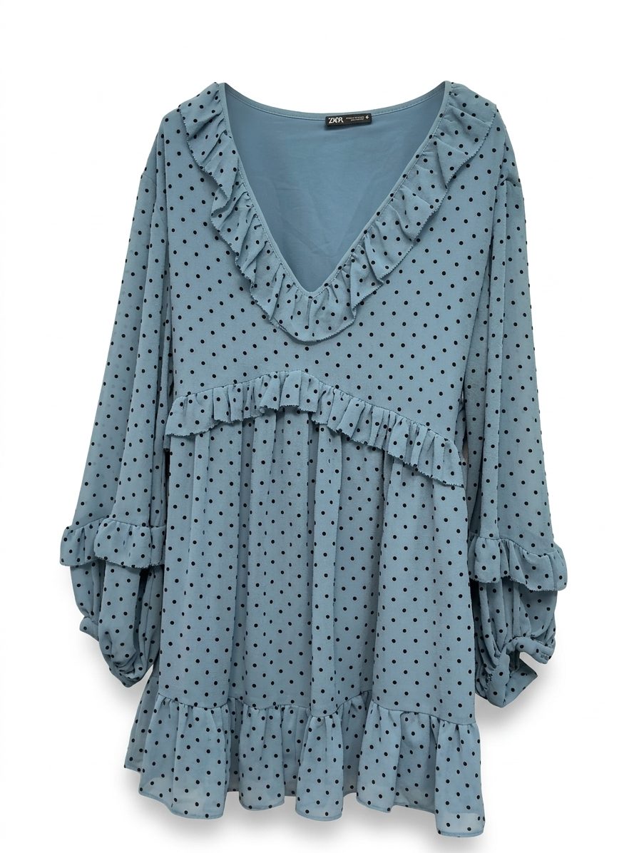 Elegante vestido corto de la marca Zara en color azul grisáceo con estampado de topos negros. Presenta un diseño fluido con escote en pico y detalles de volantes que aportan movimiento y sofisticación a la prenda.